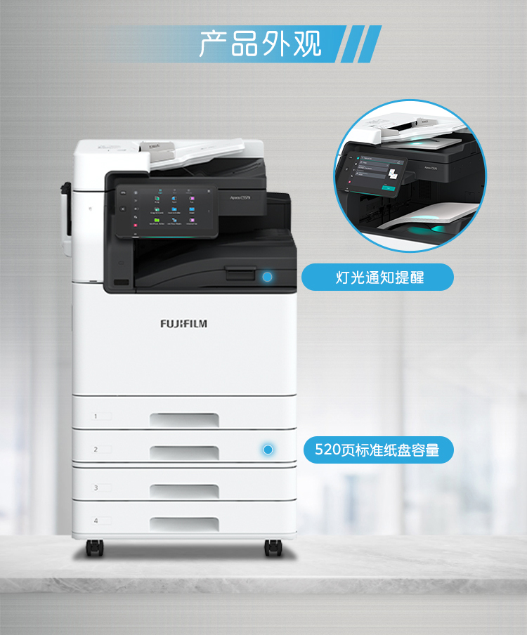 全新时代,全新Apeos,55页/分钟,A3/A4彩色双面打印/复印/扫描。