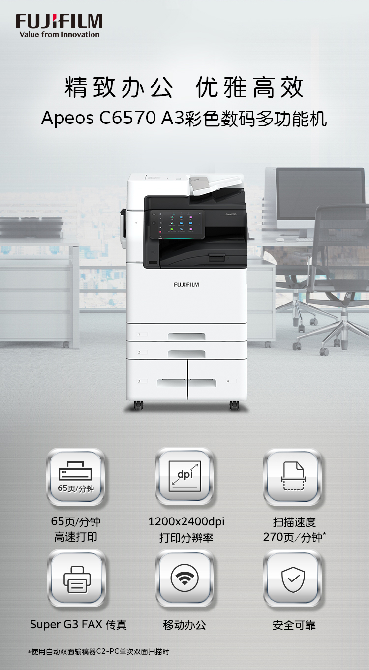 全新时代,全新Apeos,65页/分钟,A3/A4彩色双面打印/复印/扫描。