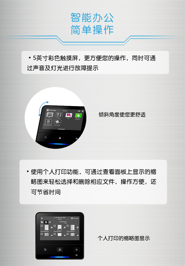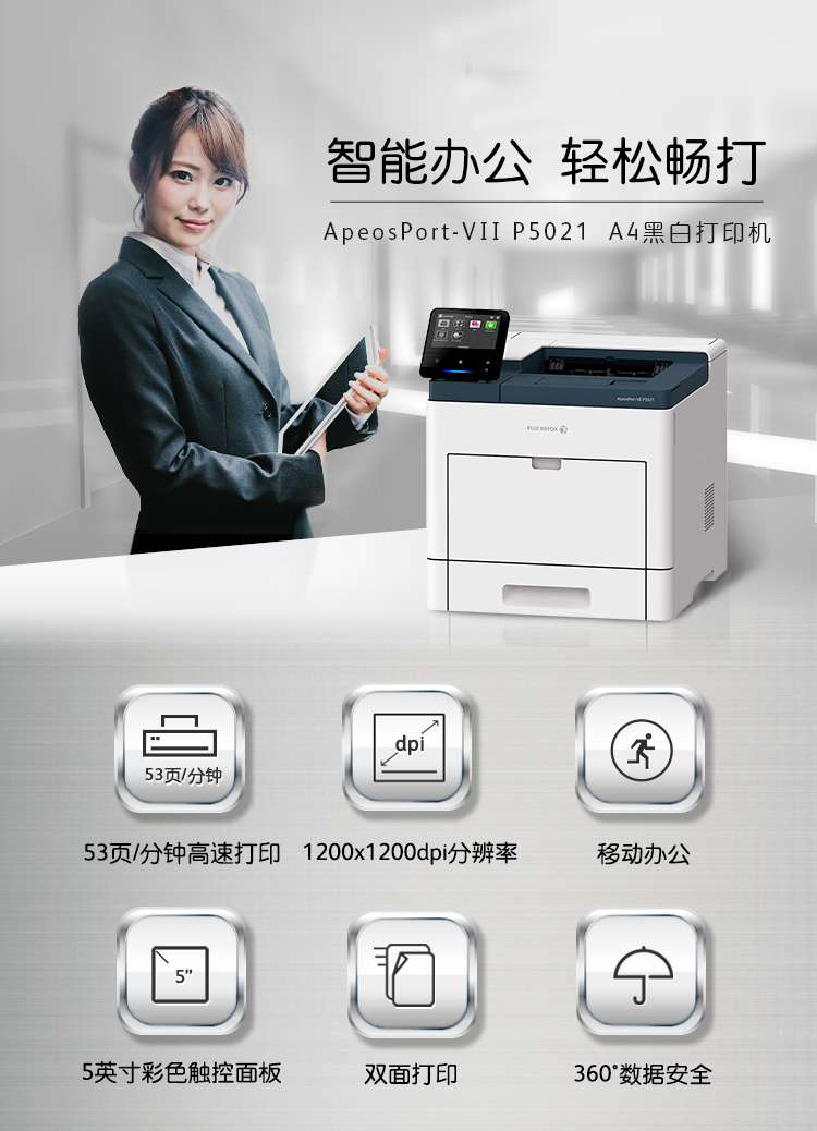 A4黑白桌面机租赁,53页/分钟高速打印,5英寸彩色触控面板。